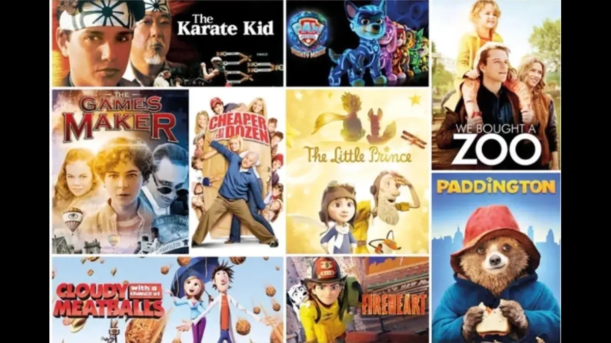A collage of family-friendly movie posters, including The Karate Kid, PAW Patrol: The Movie, We Bought a Zoo, The Little Prince, Paddington, Cloudy with a Chance of Meatballs, and other children’s and family films.